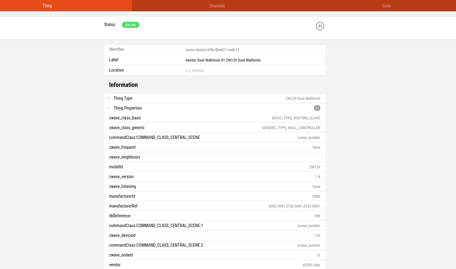 Under the most basic setup, the buttons on the wallmote will change the Scene number channel. The result will be in the form of “#.#” The ones place will be the number of the button 1 or 2, or 1 - 4 depending on whether you’ve got the two or four panel version. The decimal place is 0 for short press, 1 for long press, and 2 while press is being held down. The depreciated channels are to replicate the association groups if you wanted to set up direct links for different scene arrangements.