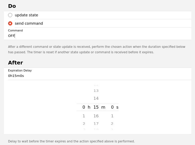 The one possible problem with this is that the expire timer cannot distinguish between the source of the ON command that starts the timer. If you manually turn on the light the same expire timer will start up and the light will turn off again after 15 minutes even if maybe you didn’t desire it. If you know you always want the light to turn off after 15 minutes no matter how it is turned on then this is the way to go.