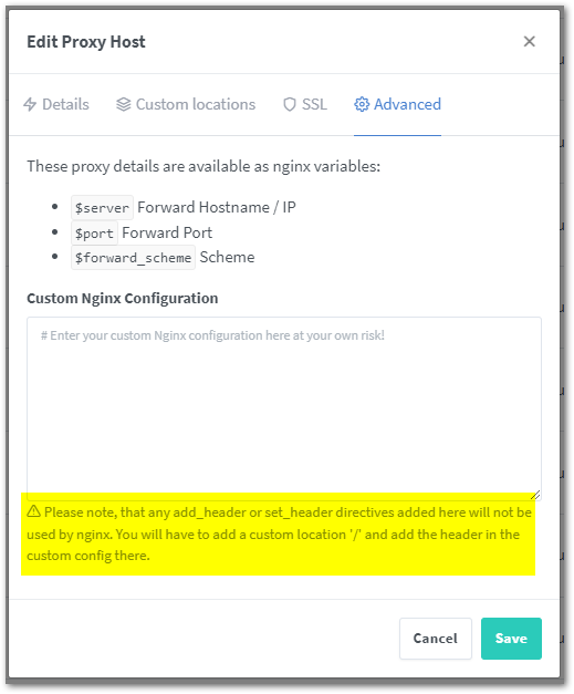 Currently I does not have used the advanced configuration inside of the nginx proxy manager.