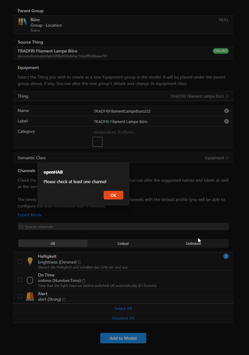 For example, I have an IKEA zigbee lightbulb, with a dimmer item attached to the dimmer channel of the lightbulb thing. Now, when I want to add the lightbulb to my model, I go to the location where that device/equipment group is supposed to be added to, I select “Add equipment from thing” and then I search for the existing thing.