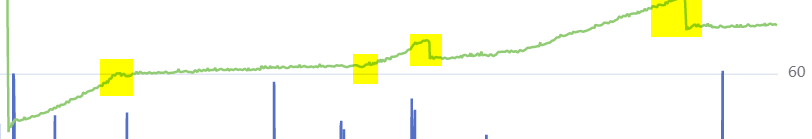 I had another one. After restart, I noticed a usage increase in memory, so I disbled all rules (first yellow box left) - leading to a NEARLY continous line but slowly increasing (up to second box left).