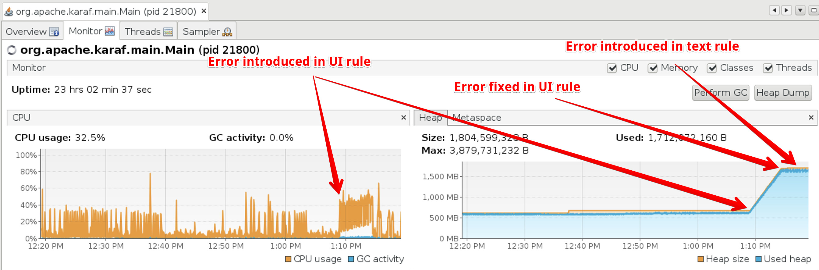 I set up the rules back in ui only and setup visualvm so i will report back.