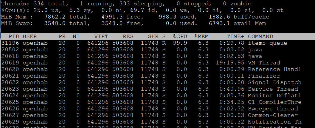 When it pins the CPU, follow Cody’s advise in this post above and run top in the terminal, get the pid of openHAB then run