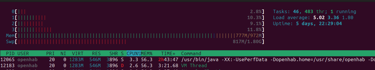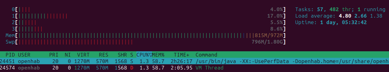 BTW OH3 and OH4 looks very similar with RAM consumption… If I remember right I was also round about 700mb… But with OH3 I had a ZWAVE system with ZWAVE.me solution also running and everything was OK. OH3 runs also with Z2M, ZWAVE, Grafana, Influx and an apache2 webserver… Everything was nice. But now i get in trouble with OH4. In the meanwhile i decided to kill ZWAVE and switch over to z2m completely. With OH4 there is more RAM free cause I don’t use ZWAVE anymore.