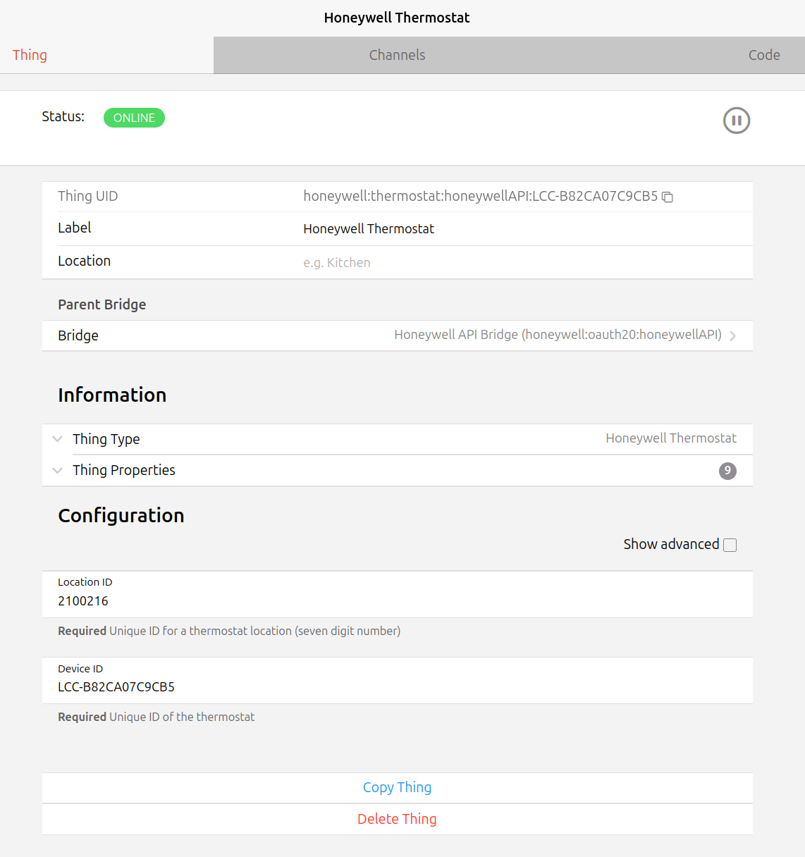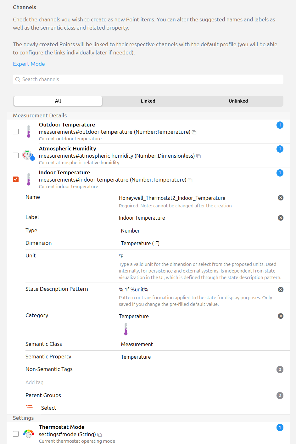 Let’s walk through the process with screen shots. Let’s pretend I just accepted a new Thermostat Thing in the Inbox. With another change @jimtng just added to OH 5 this will now take you straight to that Thing’s page so we start with: