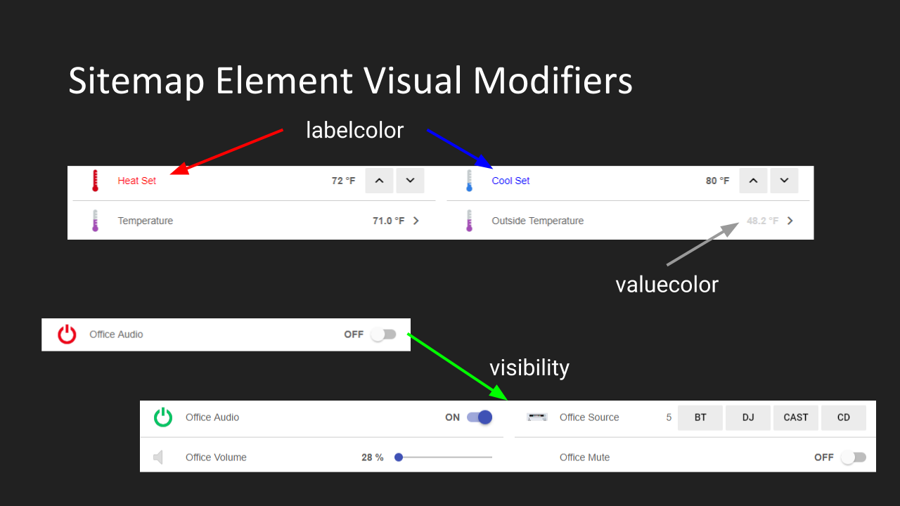 I think one of the coolest modifiers to use is the visibility option. Sometimes, you just don’t want to see all of the sitemap elements, unless a specific switch is on or another condition is true. For example, my Monoprice amp allows me to set the source, set or mute the volume and other options, per zone. But, if that zone is turned off, I may not want to see or use any of the additional settings.