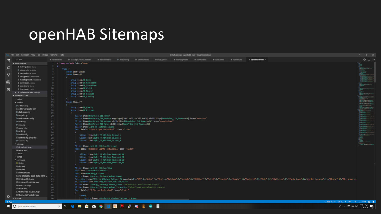 So, now let’s look at my actual sitemap definition file. Just like the rest of the openHAB configuration files, the .sitemap files live underneath the openhab-config file directory. And just like with items files, you can have multiple sitemap files. However; when you configure your user interface on your phone or the PaperUI, you will have to select only one of those files to show up. The way you do this, is by opening up PaperUI