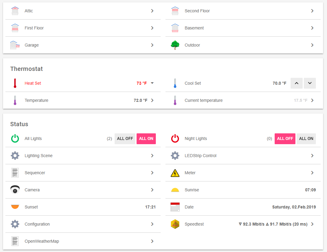 Take a look at the layout of my Basic user interface. This is my “Home” or top-level layout of the Basic UI. My items are grouped into different sections based on things like location (first floor, second floor, garage, etc..), based on function (i.e. my Thermostat) and general status information. If you notice, this layout is pretty similar to the Demo user interface you installed if you followed my steps in the original openhabian configuration video.