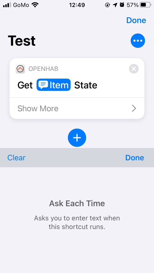 *iOS Shortcuts app, accessing the OpenHab app, the one that connects to OpenHab Cloud for notifications.