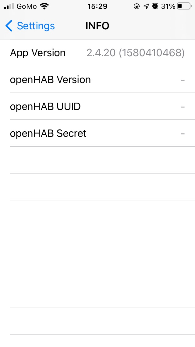 Checked mine, exactly the same. I exposed all items to myopenhab, base url is the same like yours (make sure it is the same in your openhab app) and the Info is also the same like your screenshot. Only App version is available and the rest got a - .