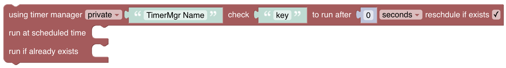| reschedule if exists | when checked, if there is already a timer by the name âTimerMgr Nameâ, reschedule it, otherwise cancel it |