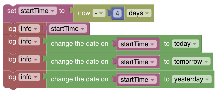 The above example creates a date time four days into the past and logs it. It then logs the results of to today, to tomorrow, and to yesterday and the logs will show that the date changes accordingly.
