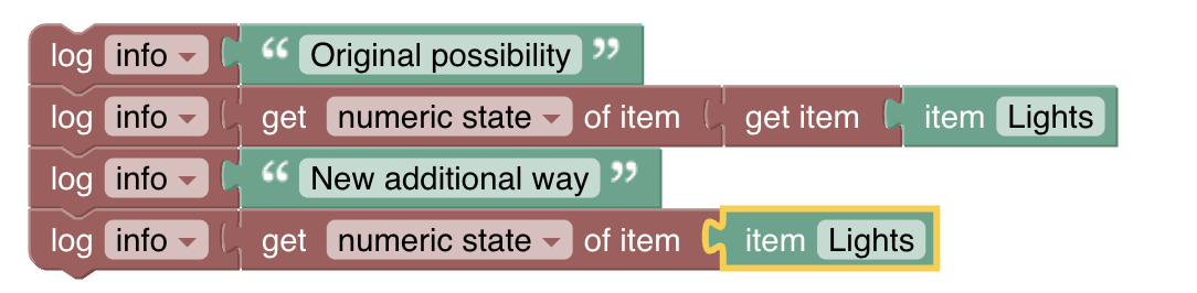 - Fixed problem where only static numbers can be used for the timer duration. Now a variable, the âget numericState from itemâ or any other block/combination of blocs that eventually evaluate to a number can be used.