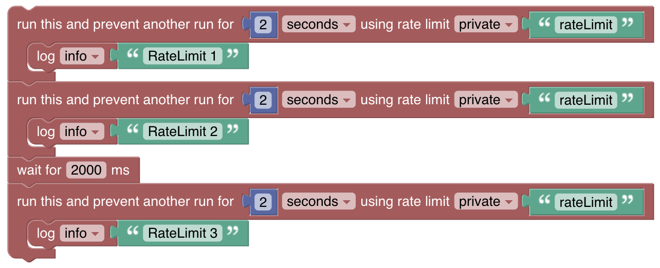 In the above example you will see âRateLimit 1â and âRateLimit 3â in the logs but not âRateLimit 2â because it happens before the 2 seconds are up.
