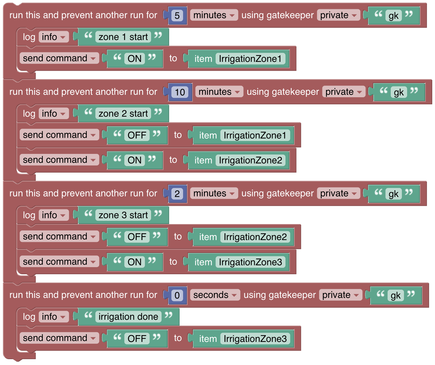 In the above example, IrrigationZone1 will be commanded ON. After five minutes itâs commanded OFF and IrrigationZone2 is commanded to ON. After ten minutes itâs commanded to OFF and IrrigationZone3 is commanded to ON. After two minutes itâs commanded to OFF. Passing a time of 0 seconds to Gatekeeper will allow subsequent calls to run immediately.