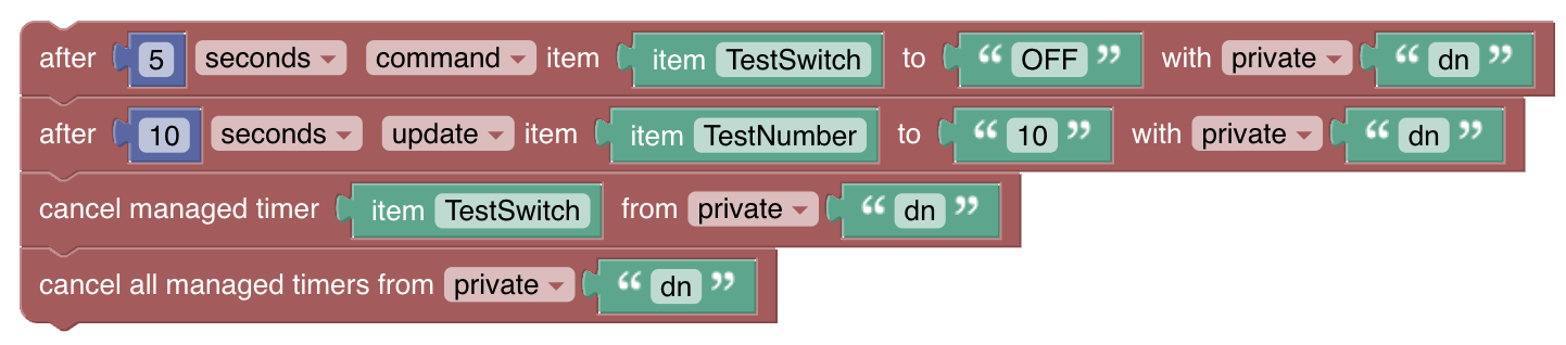The next block behaves differently from the first because the timer already exists. You will see âflappingâ in the log because the timer already exists and then the timer is rescheduled for five seconds from now. (Note: typically youâd have the one block which gets called with subsequent calls to a rule).