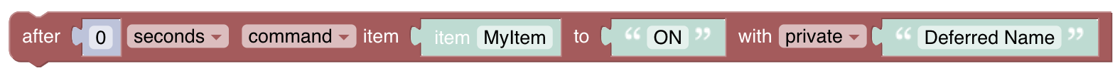 This block lets you easily schedule a command or update to an Item at a future time. The same Deferred Object can be used to schedule commands/updates to multiple Items. There is no need to instantiate more than one.
