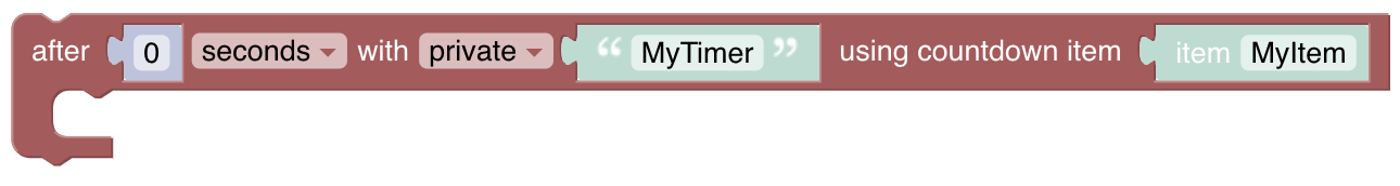 This block instantiates a CountdownTimer to run at the given time. The timer is stored in the given cache under the given name, and if there is an error in the timer, the error will be reported under that name also. Every second, the passed in countdown Item is updated with the remaining amount of time left until the Timer function is run. If the Item is a Number Item, the number of seconds left until the Timer runs is posted to that Item. If itâs a String Item, the amount of time left in HH:MM:SS format is posted to the Item.