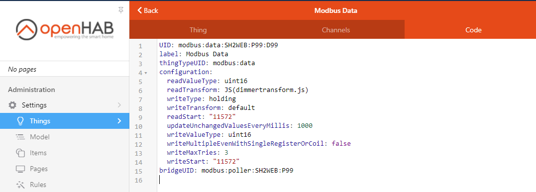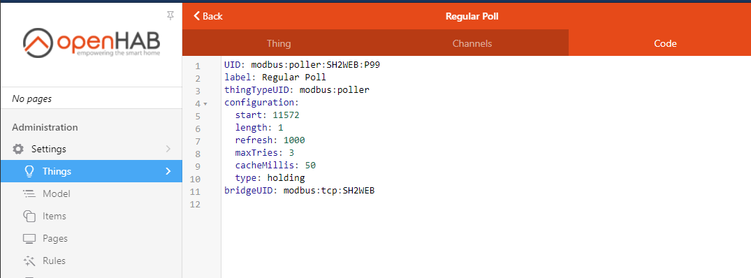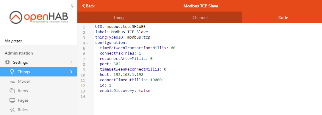 Bridge modbus:tcp:SH2WEB [ host="192.168.1.198", port=502, id=1, timeBetweenTransactionsMillis=0, reconnectAfterMillis=60000] {