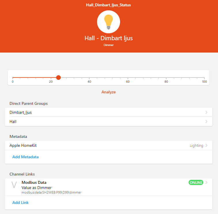 Dimmer Hall_Dimbart_ljus_Status "Hall - Dimbart ljus" <slider> (Dimbart_ljus,Hall) {homekit="Lighting", channel="modbus:data:SH2WEB:P99:D99:dimmer" }