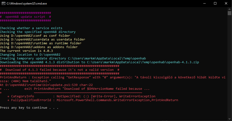 I follwed the installation as described on the openHAB page. The current version that I use is 4.0.3 I wanted to upgrate my system to 4.1.0 M3 with the update.bat file. I attached the picture from that one in the bigining. I tried with that command that you added and I always get an error for the path has been not founded (I replaced the C: with D: because that is my openhab path). I don’t what is the problem with the update… But if its so difficult maybe I will try another smart home program…