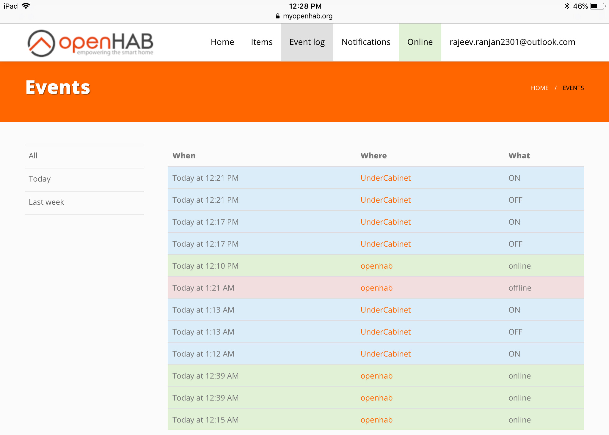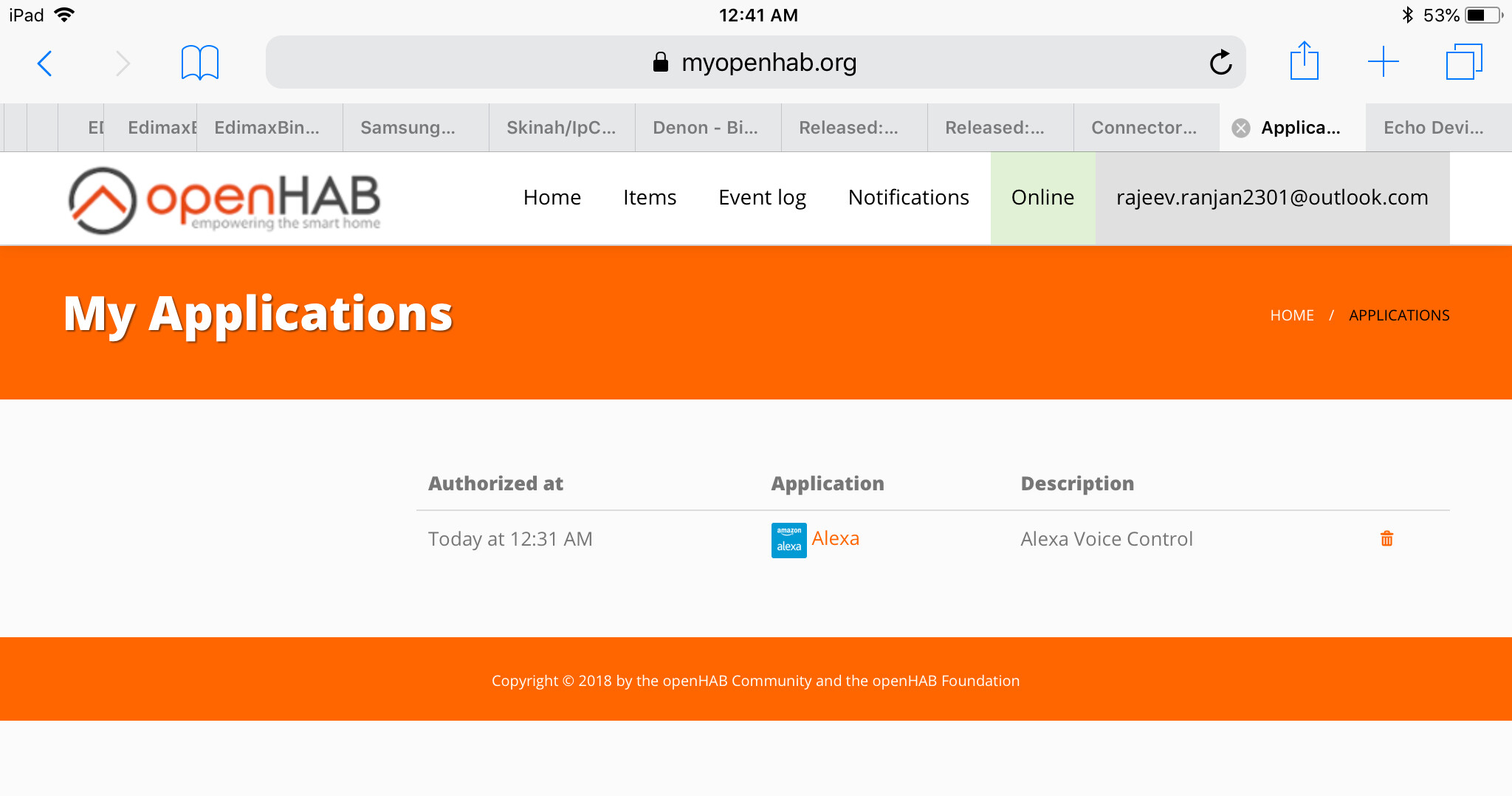 Openhab Event log* 2018-10-07 20:23:40.757 [hingStatusInfoChangedEvent] - 'amazonechocontrol:echo:account1:echo1' changed from UNKNOWN to ONLINE 2018-10-07 20:23:41.448 [hingStatusInfoChangedEvent] - 'amazonechocontrol:account:account1' changed from OFFLINE (CONFIGURATION_PENDING): Wait for login to ONLINE 2018-10-07 20:23:42.051 [hingStatusInfoChangedEvent] - 'amazonechocontrol:echo:232b79c6' changed from UNKNOWN to OFFLINE 2018-10-07 20:23:42.866 [hingStatusInfoChangedEvent] - 'amazonechocontrol:account:292e3f28' changed from OFFLINE (CONFIGURATION_PENDING): Wait for login to ONLINE