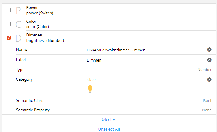 Type number : brightness "Dimmen" [ stateTopic="zigbee2mqtt/osram_e27_multicolor_livingroom/brightness", commandTopic="zigbee2mqtt/osram_e27_multicolor_livingroom/set/brightness", min=0, max=254, step=1]