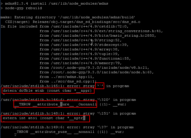 522 verbose stack Error: mdns@2.3.4 install: `node-gyp rebuild`