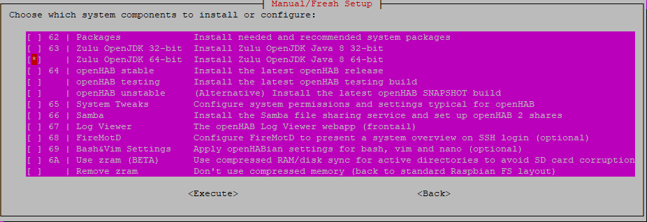 ++ whiptail --title 'Manual/Fresh Setup' --checklist 'Choose which system components to install or configure:' 20 116 13 --cancel-button Back --ok-button Execute '62 | Packages' 'Install needed and recommended system packages ' OFF '63 | Zulu OpenJDK 32-bit' 'Install Zulu OpenJDK Java 8 32-bit' OFF ' | Zulu OpenJDK 64-bit' 'Install Zulu OpenJDK Java 8 64-bit' OFF '64 | openHAB stable' 'Install the latest openHAB release' OFF ' | openHAB testing' 'Install the latest openHAB testing (milestone) build' OFF ' | openHAB unstable' '(Alternative) Install the latest openHAB SNAPSHOT build' OFF '65 | System Tweaks' 'Configure system permissions and settings typical for openHAB ' OFF '66 | Samba' 'Install the Samba file sharing service and set up openHAB 2 shares ' OFF '67 | Log Viewer' 'The openHAB Log Viewer webapp (frontail) ' OFF '68 | FireMotD' 'Configure FireMotD to present a system overview on SSH login (optional) ' OFF '69 | Bash&Vim Settings' 'Apply openHABian settings for bash, vim and nano (optional) ' OFF '6A | Use ZRAM' 'Use compressed RAM/disk sync for active directories to avoid SD card corruption' OFF ' | Uninstall ZRAM' 'Don'\''t use compressed memory (back to standard Raspbian filesystem layout)' OFF