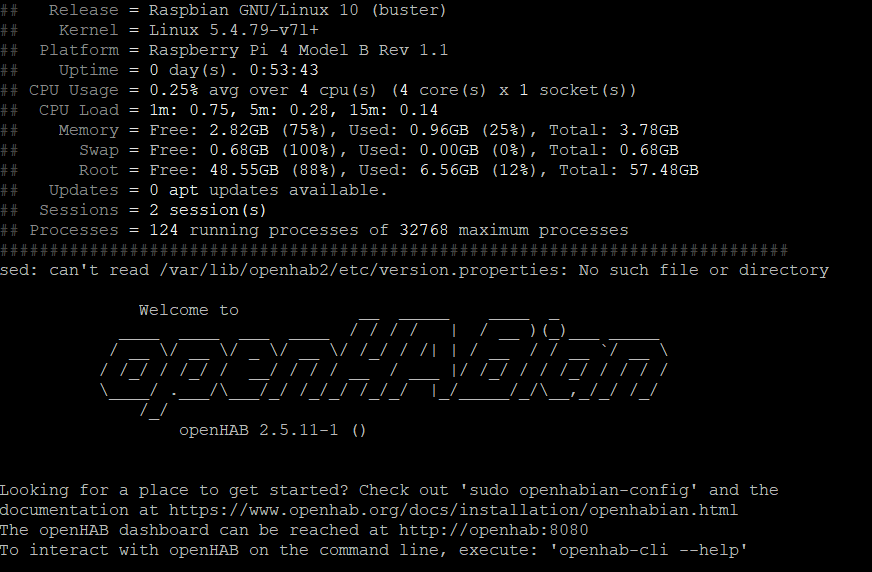 Your login shell prints out some nice information when you log in. It’s looking for the version number of the installed openHAB in the wrong location now. I don’t know what file this is defined in, mayb .profile or .basrc in your home directory. Change the “openhab2” to “openhab”.
