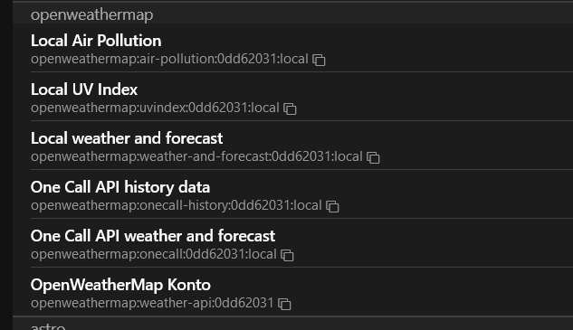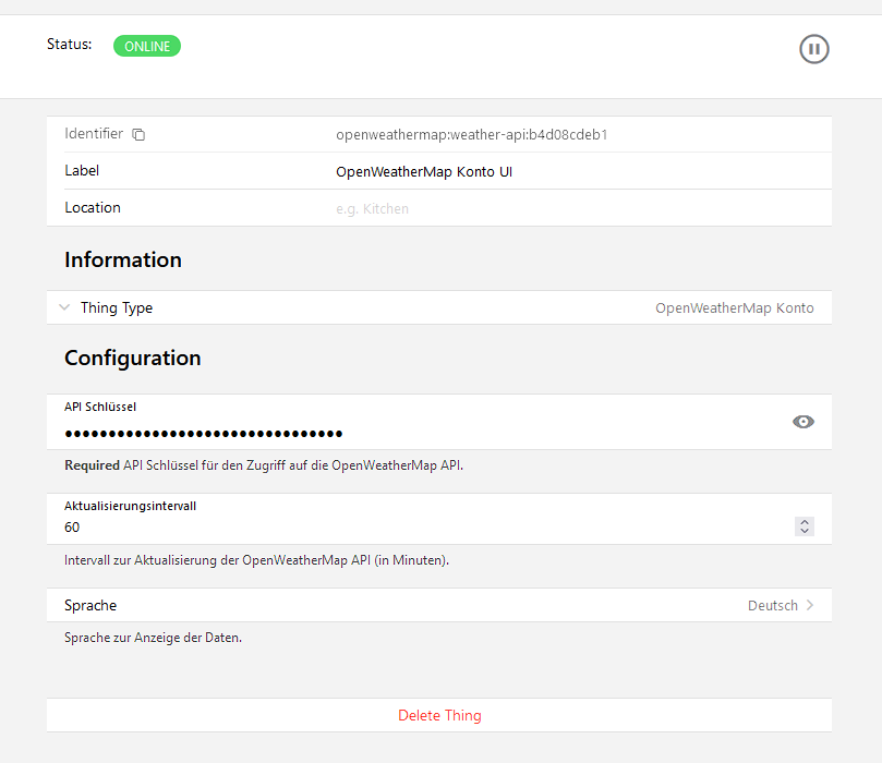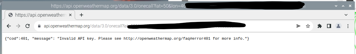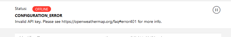 2022-08-21 10:59:38.823 [INFO ] [ab.event.ThingStatusInfoChangedEvent] - Thing 'openweathermap:onecall:api:local' changed from UNKNOWN to OFFLINE (CONFIGURATION_ERROR): UngĂŒltiger API SchlĂŒssel. Mehr Infos unter https://openweathermap.org/faq#error401.