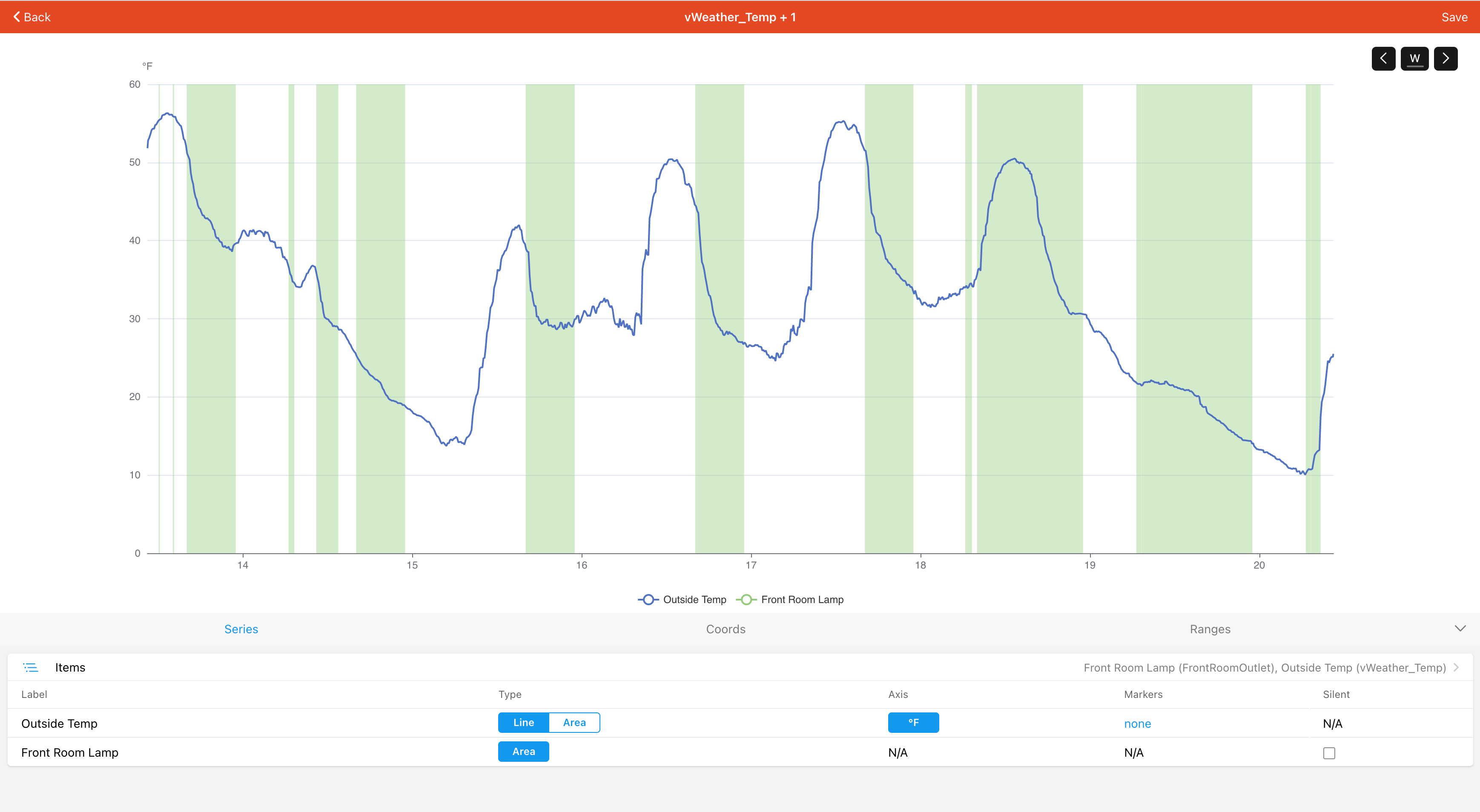 Want to show other stuff on the chart? Like I said, click on “controls” and you can customize the chart. I don’t have my heater connected to OH at the moment but here is the last week’s outside temp with the ON/OFF state of my front room light on the same chart.