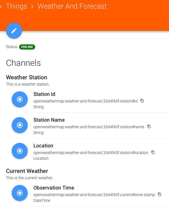 Number:Temperature Weather_OWM_Temperature "Temperature [%.1f %unit%]" <temperature> {channel="openweathermap:weather-and-forecast:<your-id-here>:local:current#temperature"}