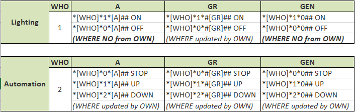 For groups I would need an example that shows what happens when one sends a GROUP command (for example: *1*0*#G## , where G is the GRroup number [1-255], also indicating which are the lights that belong to the group.