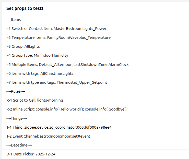 This UI widget is not a functional widget in that it is something you would want to put on your Pages. It is intended to provide examples of most of what is possible when defining properties on custom UI widgets and rule templates for reference and testing. It presents properties in all sorts of different ways and shows you what the property becomes when the user selects is. For example, the Multiple Items property shows how one can select more than one Item and the widget renders what that looks like (a comma separated list of Item names).