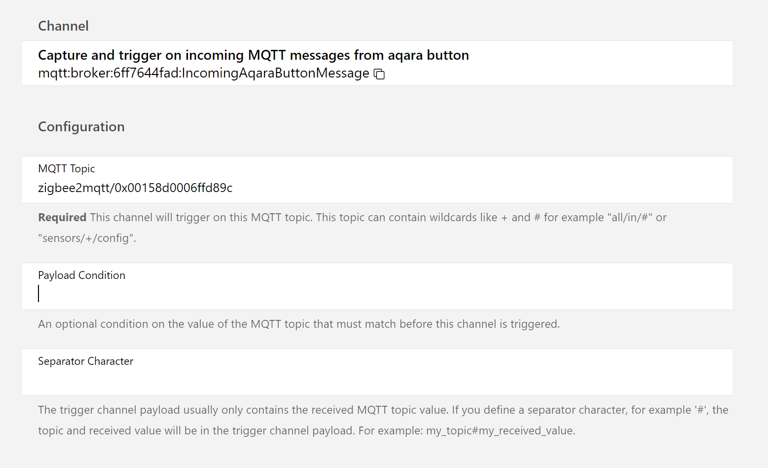 This is where I got stuck.I found the section in the MQTT broker trigger channel page very relevant since it has this Payload Condition parameter but I never figured out how to use it (if there is any use for it). The trigger works fine by the way, just wanted to distinguish between those two values