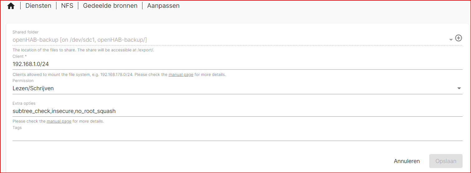 erik@MinipcLG2:~$ sudo mount -t nfs 192.168.1.10:/openHAB-backup /home/erik/Openhab-backups/