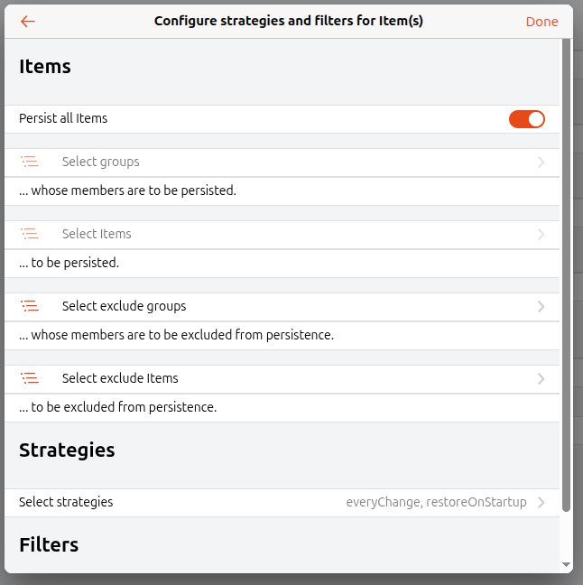 Iām sure the above result can already be somewhat achieved by creating groups for each Persistence Strategy, and selecting the applicable ones as parents at time of item creation/edit? But this creates a level of (unnecessary?) abstraction, which hides details of which items are persisted when looking at things from the persistence settings screen.