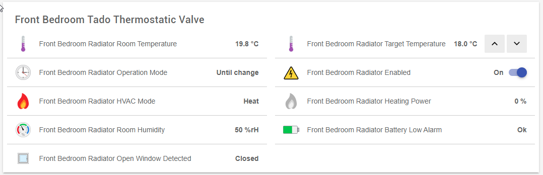 They donât have temperature sensors, so they donât pusblish the temperature in the radiator, only the current setpoint temperature. They donât publish if the are in eco or comfort mode (you can derive it from the setpoint temperature) and the mode (auto or manual) and the valve position (0 to 100%). You cannot change the program or get the program they are following (probably a limitation of TASMOTA driver, and due to TASMOTA not being paired with the valve and only using bluetooth beacons).