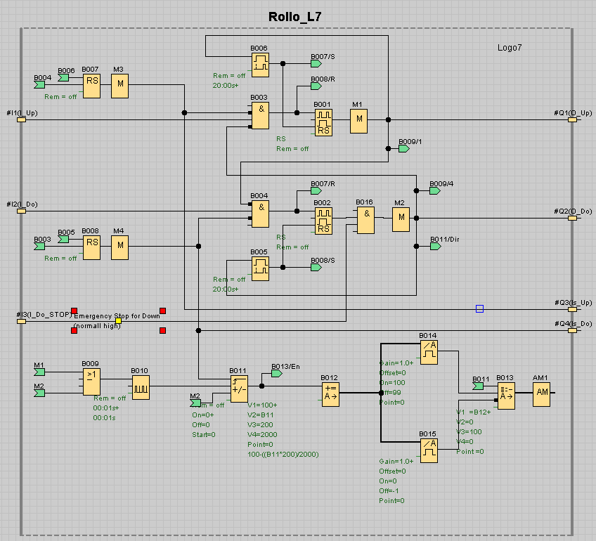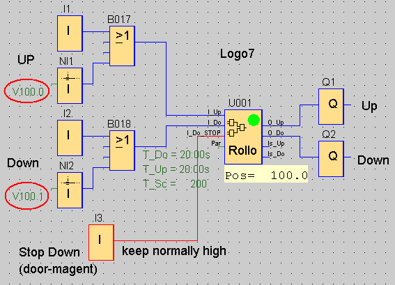 Pulse on input I_UP drives the rollo high, pulse on I_DO drives the rollo down. The time rollo must be driven, are given by UDF parameters T_UP and T_DO respectively.