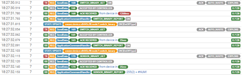 Which one of these two doesn’t work - from what I can see in the logs, both node 3 and node 7 look to be working exactly the same from the binding perspective - the messages being processed, and the commands being sent are the same. We always have OnOffType for both commands and sensor data, so I’m at a loss to see the difference and I don’t understand the issue - sorry again
