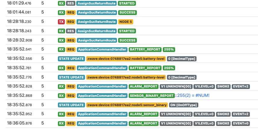 2022-12-22 18:35:52.838 [DEBUG] [.commandclass.ZWaveAlarmCommandClass] - NODE 5: Alarm Type = SMOKE (0)