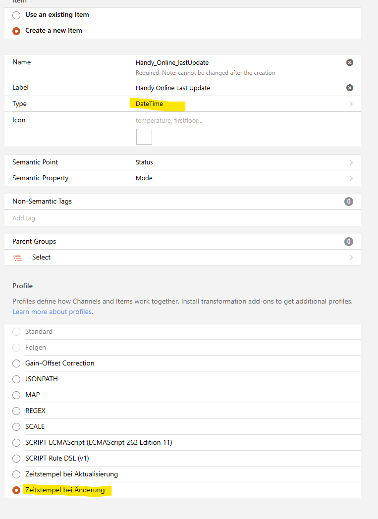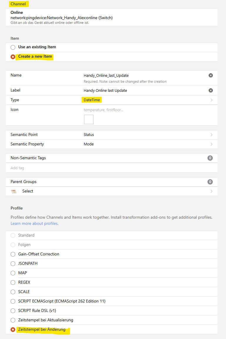 The thing comes from the network binding and the item represents the ON/OFF status of the cell phone. In addition, there is an item in the timestamp of the last change with the above-mentioned profile.