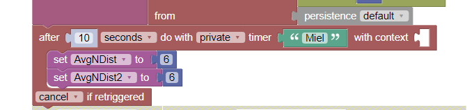 The timer runs for 10 sec, if it’s not retrgitriggered within the 10secs, than there’s obviously no update in distance and I set both variables to 6 (out of range). If the timer is retriggered, I cancel it.