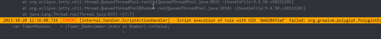 2023-10-20 12:07:03.398 [ERROR] [internal.handler.ScriptActionHandler] - Script execution of rule with UID ‘0e0284f2af’ failed: org.graalvm.polyglot.PolyglotException: TypeError: invokeMember (plusMinutes) on java.time.ZonedDateTime@1c4161f failed due to: Cannot convert ‘[object Object]’(language: JavaScript, type: d) to Java type ‘long’: Invalid or lossy primitive coercion.