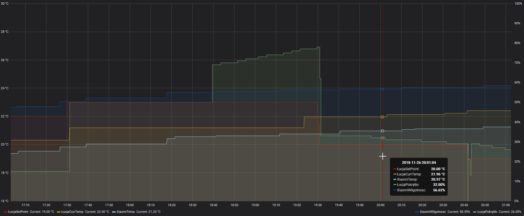 The second ruleset is for actual temperature regulation. At first there is calculated es mixed temperature from all sensor (two Spirits an external Sensor). I’m not using the average, as the temperature from the external sensor is more weighted than the information from the Spirits. The result is stored in the item “MixedTempXX”