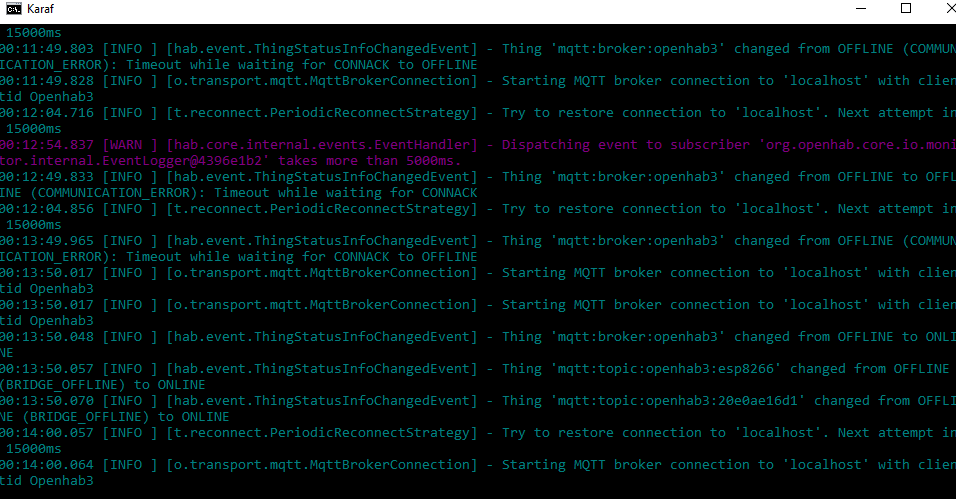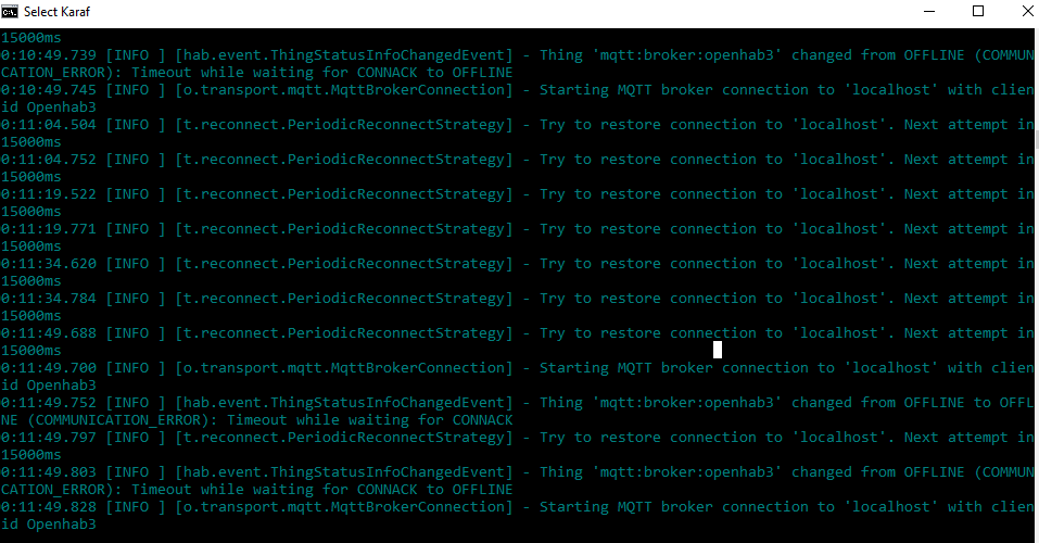 I have established broker connection with openhab using UI interface provided with openhab3. But after few minutes it tells me its offline. Once its offline, i need to go to the mosquitto broker terminal and need to press any button (input), than only above connection of broker to openhab gets online (that too for few minutes).