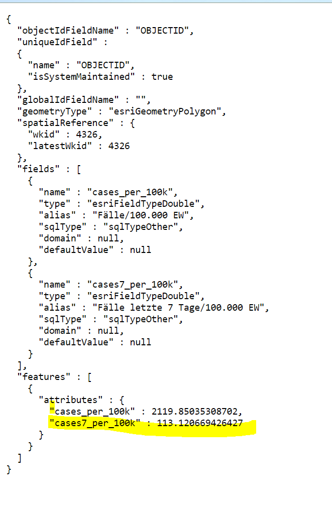 baseURL: https://services7.arcgis.com/mOBPykOjAyBO2ZKk/arcgis/rest/services/RKI_Landkreisdaten/FeatureServer/0/query?where=&objectIds=76&time=&geometry=&geometryType=esriGeometryEnvelope&inSR=&spatialRel=esriSpatialRelIntersects&resultType=none&distance=0.0&units=esriSRUnit_Meter&returnGeodetic=false&outFields=cases_per_100k%2Ccases7_per_100k&returnGeometry=false&returnCentroid=false&featureEncoding=esriDefault&multipatchOption=xyFootprint&maxAllowableOffset=&geometryPrecision=&outSR=4326&datumTransformation=&applyVCSProjection=false&returnIdsOnly=false&returnUniqueIdsOnly=false&returnCountOnly=false&returnExtentOnly=false&returnQueryGeometry=false&returnDistinctValues=false&cacheHint=false&orderByFields=&groupByFieldsForStatistics=&outStatistics=&having=&resultOffset=&resultRecordCount=&returnZ=false&returnM=false&returnExceededLimitFeatures=true&quantizationParameters=&sqlFormat=none&f=pjson&token=