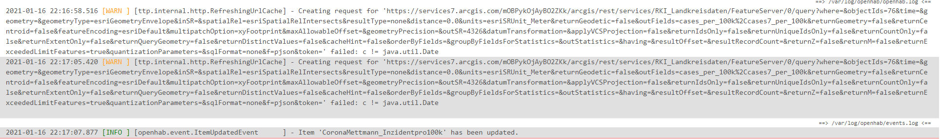 2021-01-16 22:57:45.548 [WARN ] [ttp.internal.http.RefreshingUrlCache] - Creating request for 'https://services7.arcgis.com/mOBPykOjAyBO2ZKk/arcgis/rest/services/RKI_Landkreisdaten/FeatureServer/0/query?where=&objectIds=76&time=&geometry=&geometryType=esriGeometryEnvelope&inSR=&spatialRel=esriSpatialRelIntersects&resultType=none&distance=0.0&units=esriSRUnit_Meter&returnGeodetic=false&outFields=cases_per_100k%2Ccases7_per_100k&returnGeometry=false&returnCentroid=false&featureEncoding=esriDefault&multipatchOption=xyFootprint&maxAllowableOffset=&geometryPrecision=&outSR=4326&datumTransformation=&applyVCSProjection=false&returnIdsOnly=false&returnUniqueIdsOnly=false&returnCountOnly=false&returnExtentOnly=false&returnQueryGeometry=false&returnDistinctValues=false&cacheHint=false&orderByFields=&groupByFieldsForStatistics=&outStatistics=&having=&resultOffset=&resultRecordCount=&returnZ=false&returnM=false&returnExceededLimitFeatures=true&quantizationParameters=&sqlFormat=none&f=pjson&token=' failed: c != java.util.Date