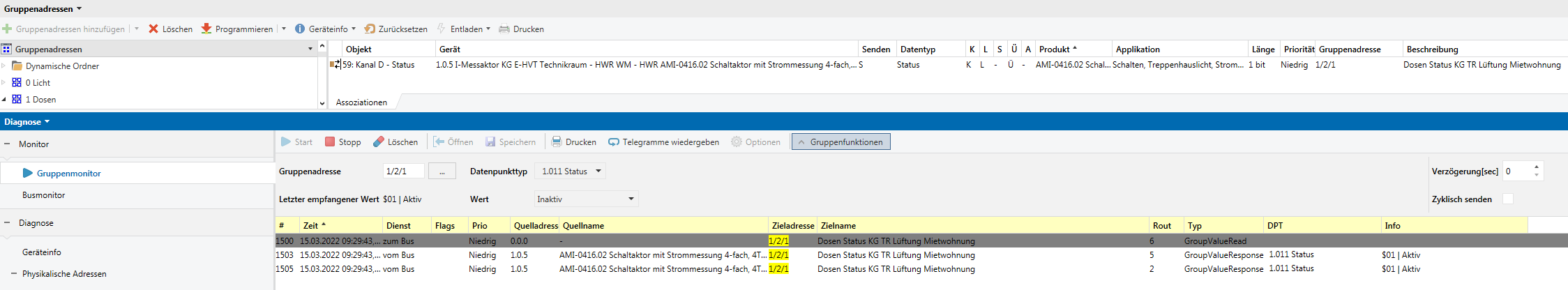 Here a ETS screen shot of one of the mentioned GA and a corresponding trace via bus monitor. The flags are set correctly and the device reacts with a GroupValueResponse.